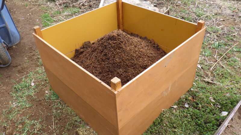 堆肥枠はパネコート(厚さ12mm)で新しく作成しました。パネコート2枚で、90cm × 90cm ×30cmの堆肥枠が三段できます。ウレタン塗装された黄色いツルツル面を内側にし、角材(38mm角)で固定(ネジ止め)して枠に。外側と角材には防腐塗料を塗りました。